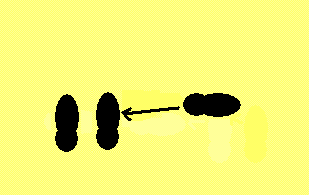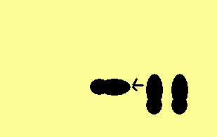 ①足をそろえた状態から、右足を横に踏み出す。この時着くのはつま先だけだ。図に有るとおり、体が変になりそうな踏み出しだが、踏み出す前に、両足ごと左に向かうように体をひねりつつ、感覚で言えば後ろに一歩下がるように踏み出せばOKである。