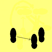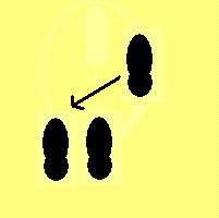 ③右足を斜めに踏み出す。この図では、べったりと足をフロアについているように見えるが、ここではつま先を上げ、カカトのみを床につける。つまり重心は左足に残したままと言うことだ。